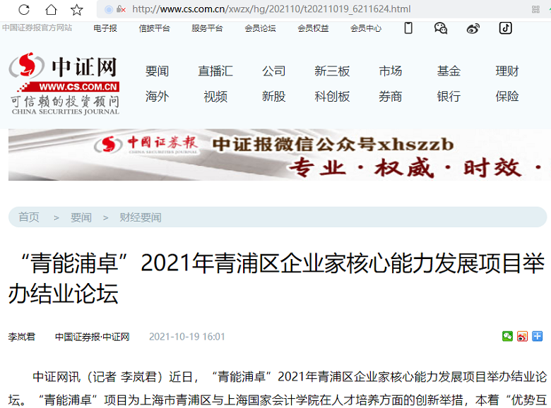 “青能浦卓”2021年青浦区企业家核心能力发展项目举办结业论坛【2021年10月19日,中国证券报】