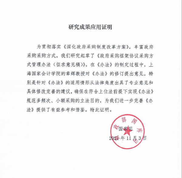 为贯彻落实《深化政府采购制度改革方案》,丰富政府采购方式,由财政部国库司研究起草了《政府采购框架协议采购方式管理办法(征求意见稿)》。近日,我院章辉教授对《办法》的修订提出意见,针对《办法》的适用情形从法律角度出具了专业意见和具体修改完善的建议,确保在符合上位法前提下实现《办法》规范多频次、小额采购的立法目的,为国库司进一步完善《办法》提供了有益参考和借鉴。