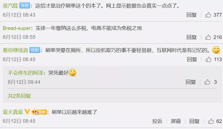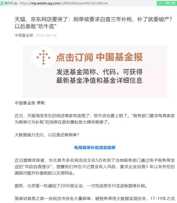 葛玉御:天猫、京东网店要哭了:刷单被要求自查三年补税,补了就要破产?以后谁敢"吹牛皮"【2020年6月14日,中国基金报】