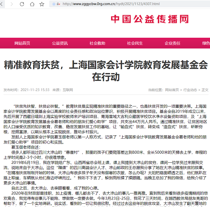 精准教育扶贫,上海国家会计学院教育发展基金会在行动【2021年11月23日,中国公益传播网】