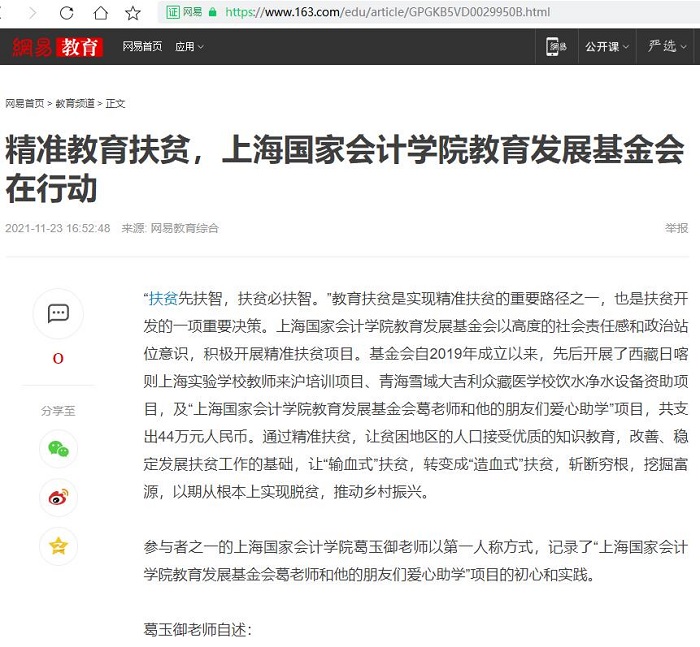 精准教育扶贫,上海国家会计学院教育发展基金会在行动【2021年11月23日,网易-教育】