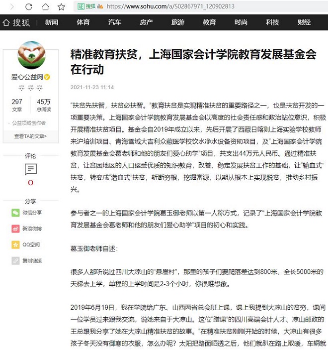 精准教育扶贫,上海国家会计学院教育发展基金会在行动【2021年11月23日,搜狐网】