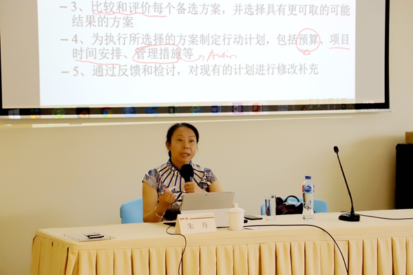 朱老师首先通过让同学们讨论今年CPA的备考情况,来了解项目管理所具备的环节。同学们回顾自己的备考计划与执行情况,分组分享了自己的心得。经过讨论后大家纷纷表示计划报考的数量与实际参考的数量不一致,甚至实际参加考试的科目也准备的不充分,计划执行情况不容乐观。大家总结出了如下几点原因:突发情况较多、没有为最后期限预留提前量、过于自信报了太多科目、不自律无法按照计划执行等。朱老师微笑着安抚了我们,告诉我们历年学生的报考情况也大多如此,这种情况的一部分原因是因为我们没有用系统的方法进行项目管理。将个体的CPA的备考过程看作是一个简单的项目管理工作,朱老师为我们引入了项目管理的知识体系,其中最重要的一个理论就是PDCA循环理论,按照PDCA循环理论对项目进行细化和分解可以帮助我们实现目标,而这个理论可以运用到我们学习与生活中的许多方面。PDCA循环的前提是要有明确且清晰的目标,其中P是指计划,即为我们的目标设定具体计划,在计划过程中要注意把计划的时间明确到可达到的最小单位,比如说按天数计划,同时在我们的计划中一定要为突发事件预留时间,要准备备选方案。D是指执行,在执行过程中要考虑风险的规避,执行需要注重细节,细节决定成败。C是指检查,我们应该实时检查计划的执行是否按照原定轨道进行,如果有所偏离,就要进入到纠偏程序。A是指行动,当计划偏离后,我们不断反思总结,采取行动把它拉回原定计划中。同时每结束一个PDCA循环,我们要需要对上一个计划周期进行复盘与纠偏,在下一个循环中调整计划,不断改进以便能顺利达到我们的目标。在学习完之后同学们也进行了关于“顺利毕业”的项目管理展示,朱老师指出,我们的毕业论文也是一种项目管理,相信同学们在系统学习了PDCA循环理论后,可以利用项目管理的相关知识帮助我们做好风险规避,顺利完成毕业论文的撰写。