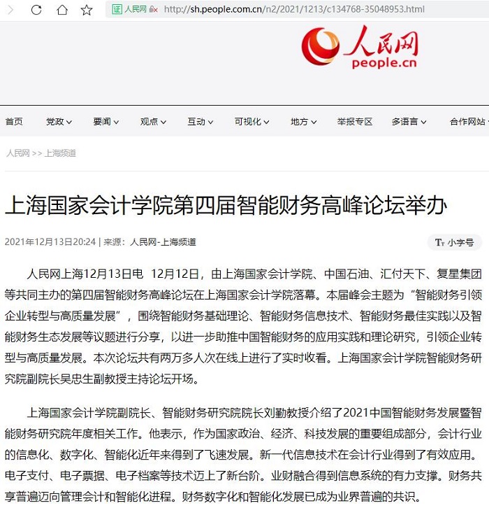 上海国家会计学院第四届智能财务高峰论坛举办【2021年12月13日,人民日报】