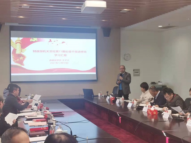 与会人员共同观看了中央财经委员会办公室副主任韩文秀解读中央经济工作会议精神辅导视频,深入学习贯彻中央经济工作会议部署,认真贯彻落实2021年全国财政工作会议精神,努力做好学院期末年初工作谋划。公共管理培训部党支部王子元同志围绕坚定理想信念、增强理论修养、以学促做等内容,分享了在财政部机关党校第73期处级干部进修班的学习体会。