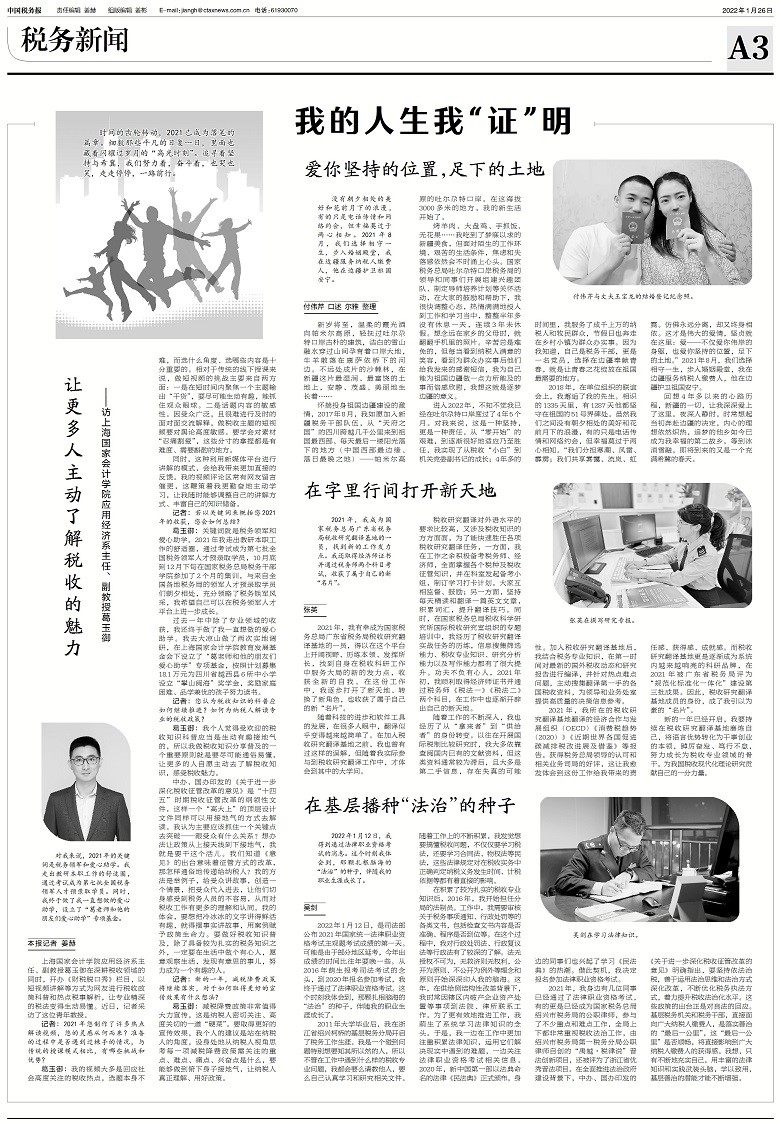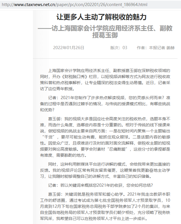 葛玉御:让更多人主动了解税收的魅力——访上海国家会计学院应用经济系主任、副教授葛玉御【2022年1月26日,中国税务报】