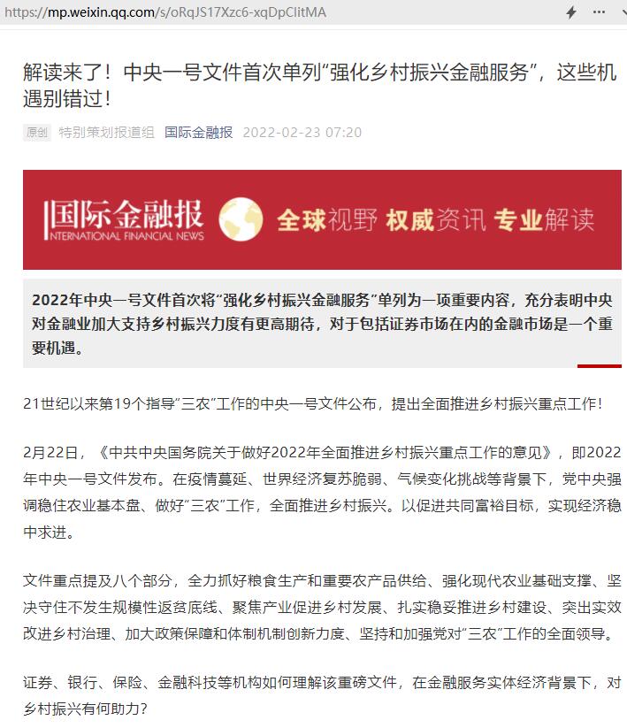 叶小杰:解读来了!中央一号文件首次单列“强化乡村振兴金融服务”,这些机遇别错过!【2022年2月23日,国际金融报】