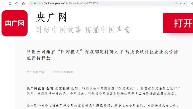 叶小杰:科创公司频启“回购模式”深度绑定科研人才 高成长硬科技企业投资价值尚待释放【2022年3月24日,央广网】