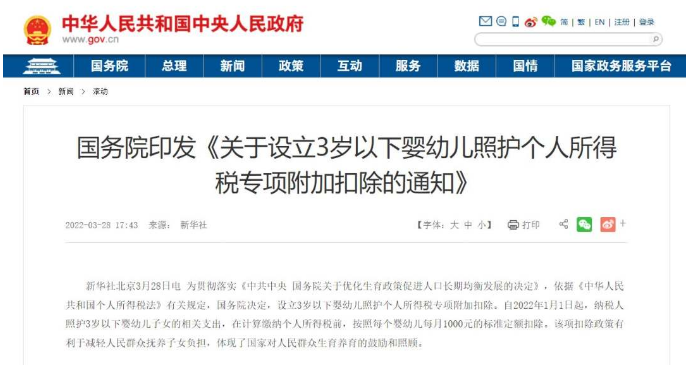 国务院今天(28)发布通知,设立3岁以下婴幼儿照护个人所得税专项附加扣除,按照每个婴幼儿每月1000元的标准定额扣除。这也是在现有的六项个税专项附加扣除基础上,新增加的扣除项目。请听报道: