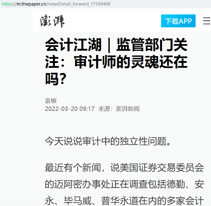 袁敏:会计江湖|监管部门关注:审计师的灵魂还在吗?【2022年3月20日,澎湃新闻】