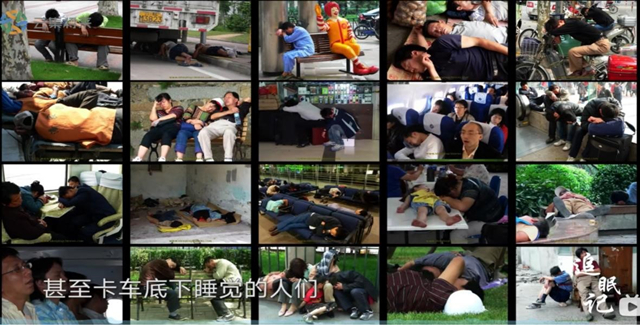 第二部《追梦人》通过选取典型行业---医生、媒体人、IT工作者,典型群体---母亲,通过观察他们的睡眠状况,真实记录了当下中国社会不同阶层人们的生活状态。《追梦人》首先呈现了普通中国人在公共空间里瞌睡的照片,这是由一名德国摄影师哈格曼在中国工作七年所记录的,他说:“这些在水泥地上、三轮车上、花坛边、甚至卡车地下睡觉的人们,他们的平静、灵活性和适应能力,令他着迷”。德国摄影师的偶然发现,揭开了我们身处飞速变化时代的一个有趣断面。不知从何时起,中国人从来没有像现在这么困。通过睡觉,发生在你我身边多种五味杂陈的现实人生,就这样扑面而来。