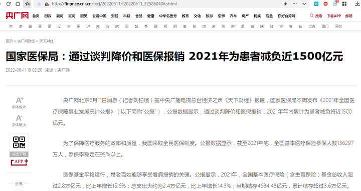 李颖琦:国家医保局:通过谈判降价和医保报销 2021年为患者减负近1500亿元【2022年6月11日,央广网】