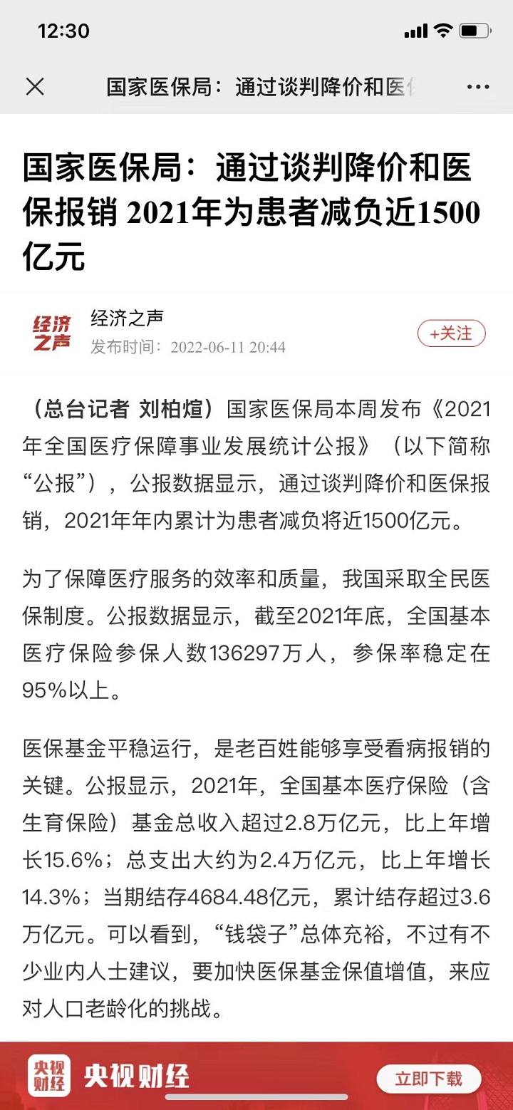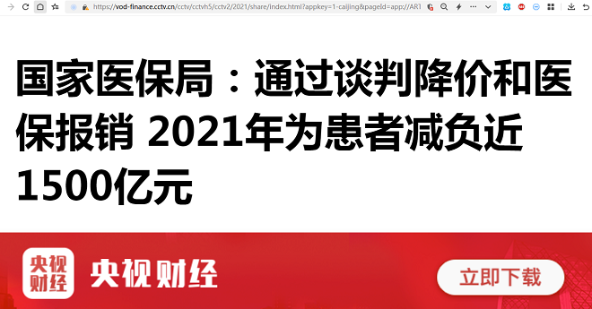 李颖琦:国家医保局:通过谈判降价和医保报销 2021年为患者减负近1500亿元【2022年6月11日,央视财经】