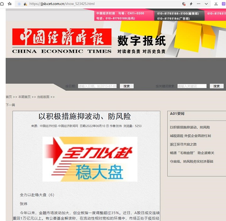 叶小杰:以积极措施抑波动、防风险【2022年6月10日,中国经济时报】