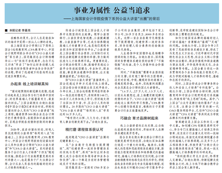 白晓红:事业为属性 公益当追求——上海国家会计学院疫情下系列公益大讲堂“出圈”的背后【2022年7月1日,中国会计报】