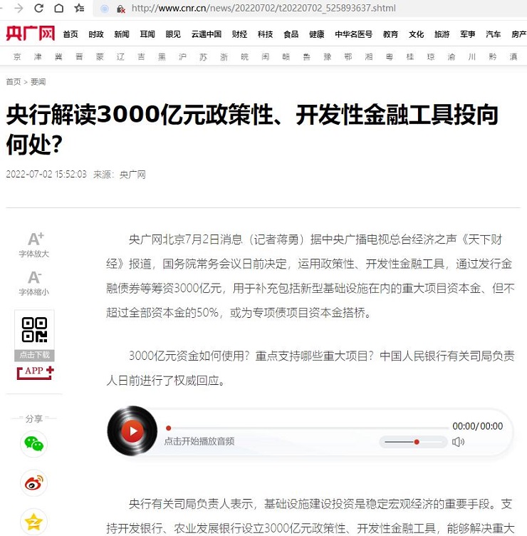 叶小杰:央行解读3000亿元政策性、开发性金融工具投向何处?【2022年7月2日,央广网】