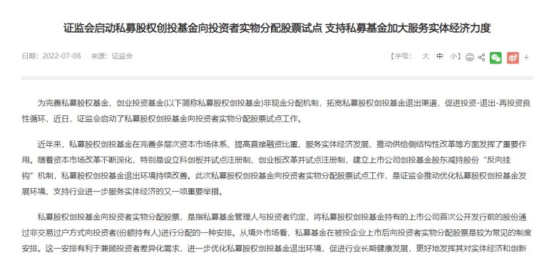 7月8日,证监会官网显示,近日证监会启动了私募股权创投基金向投资者实物分配股票试点工作。完善私募股权创投基金非现金分配机制,促进投资-退出-再投资良性循环,支持私募股权创投基金进一步服务实体经济。