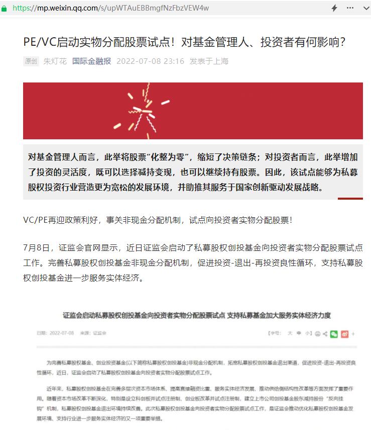 叶小杰:PE/VC启动实物分配股票试点!对基金管理人、投资者有何影响?【2022年7月8日,国际金融报】
