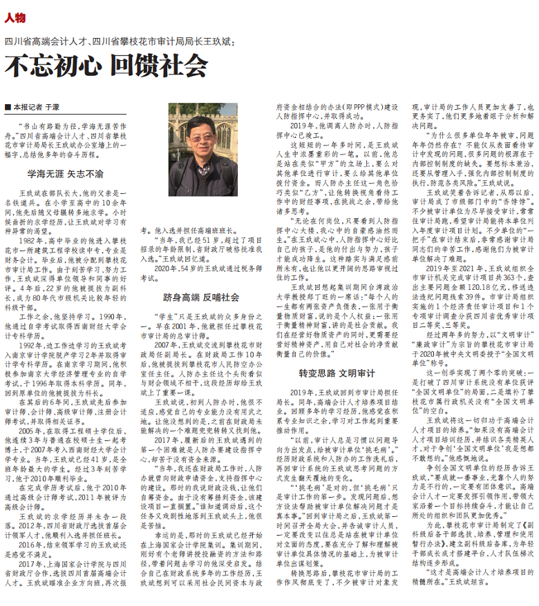 四川省高端会计人才、四川省攀枝花审计局局长王玖斌:不忘初心 回馈社会【2022年7月8日,中国会计报】