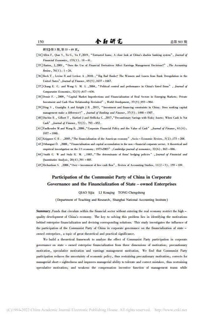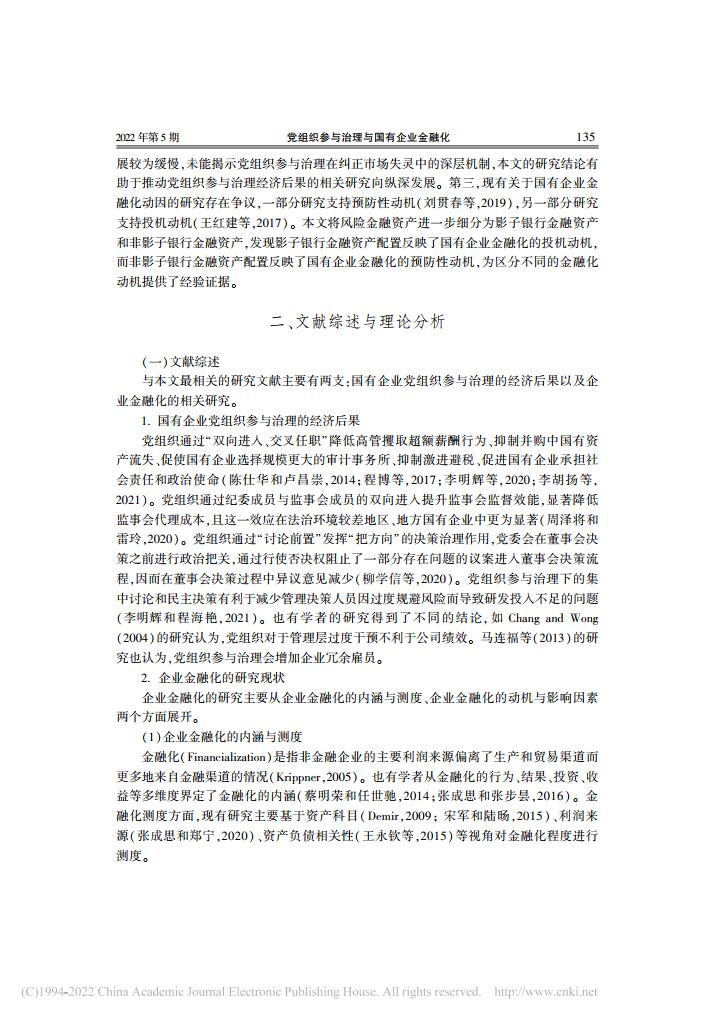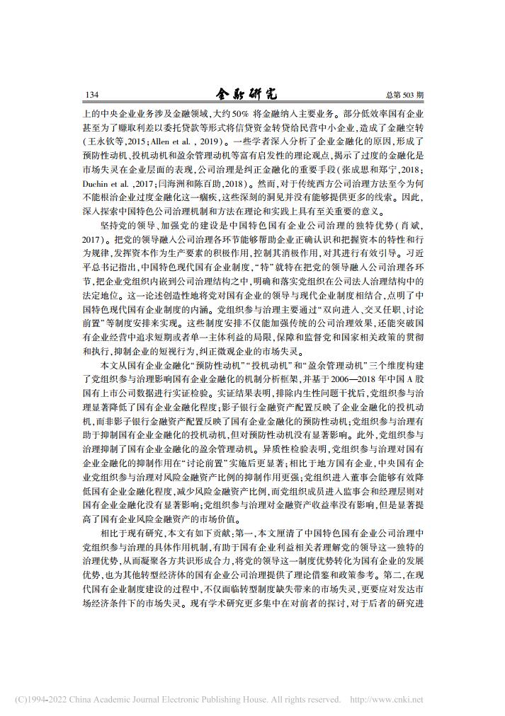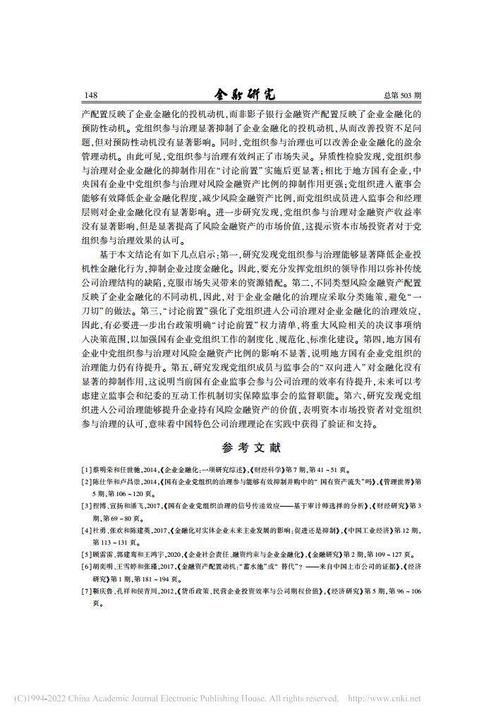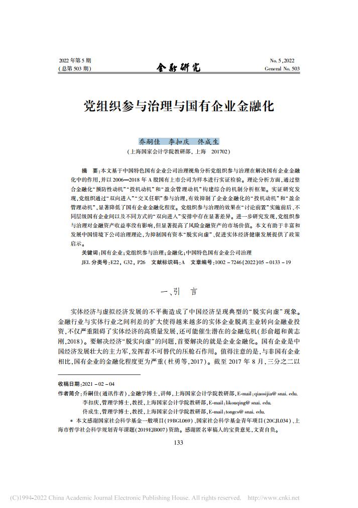 乔嗣佳、李扣庆、佟成生:党组织参与治理与国有企业金融化【2022年第5期,金融研究】