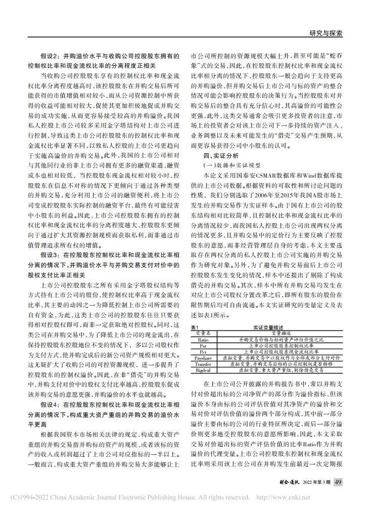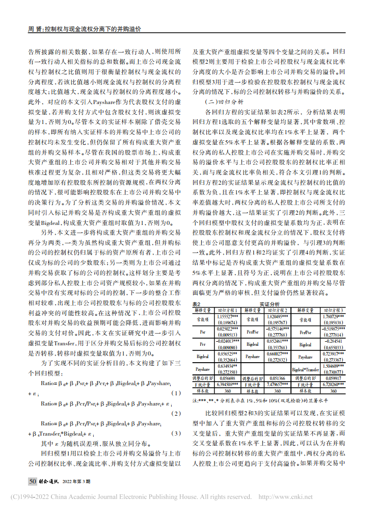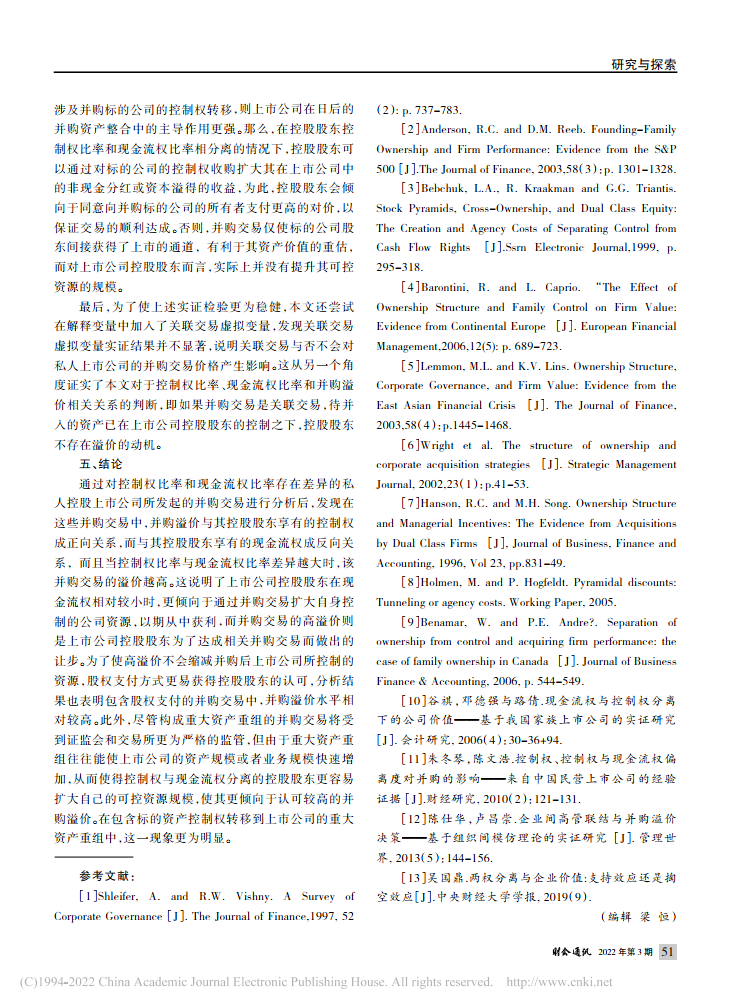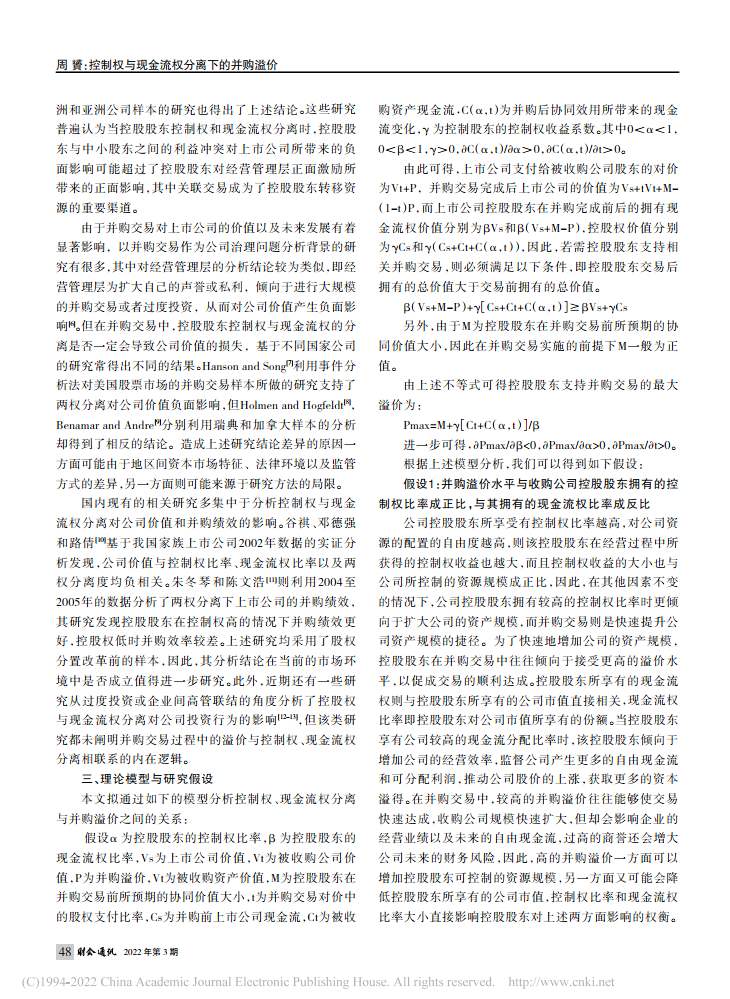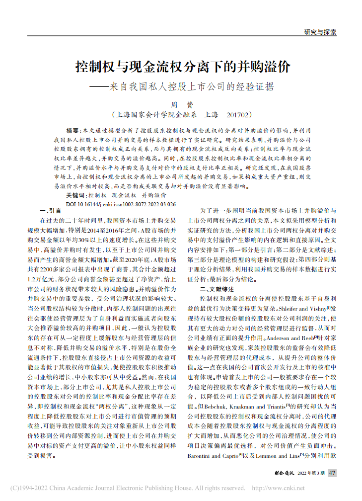 周贇:控制权与现金流权分离下的并购溢价——来自我国私人控股上市公司的经验证据【2022年第3期,财会通讯】