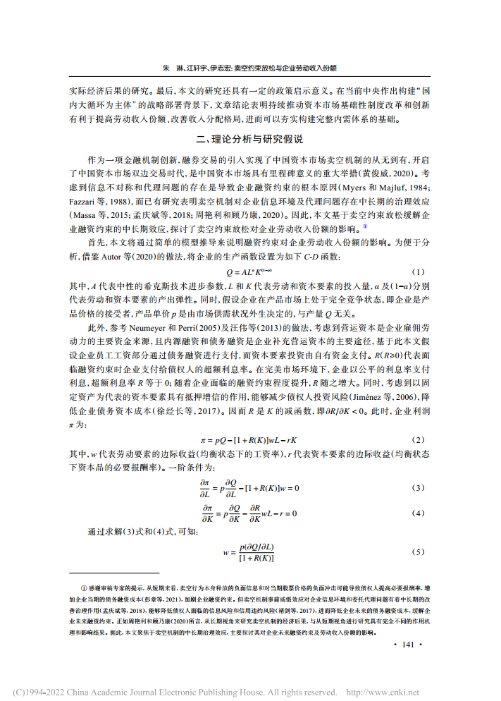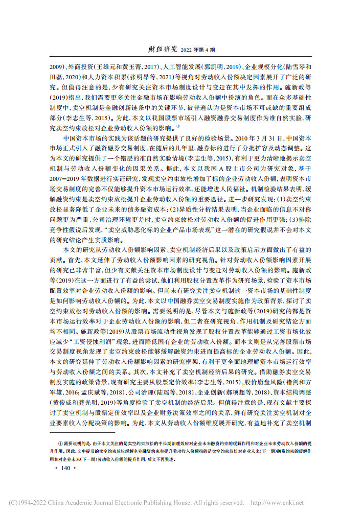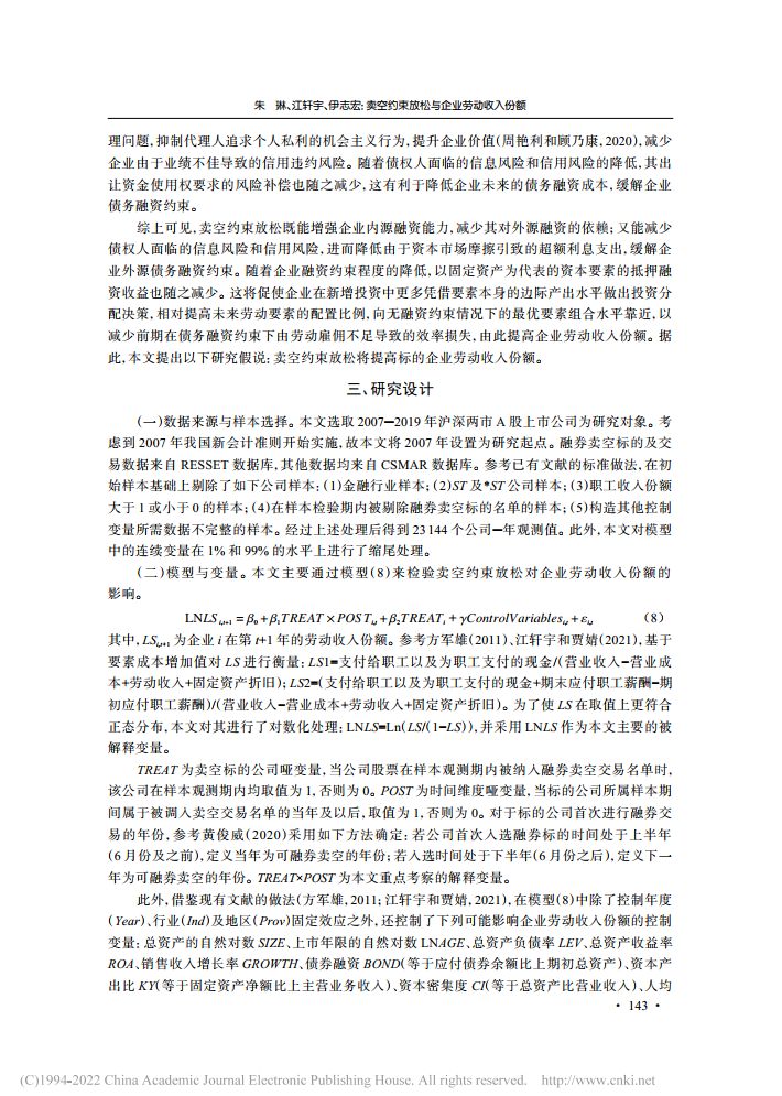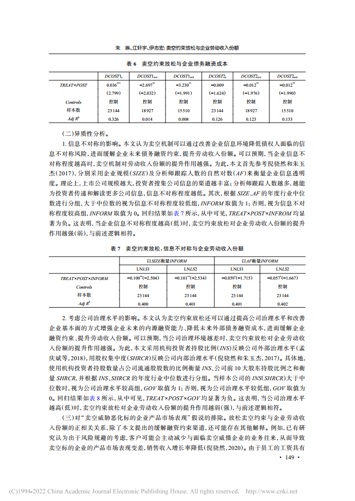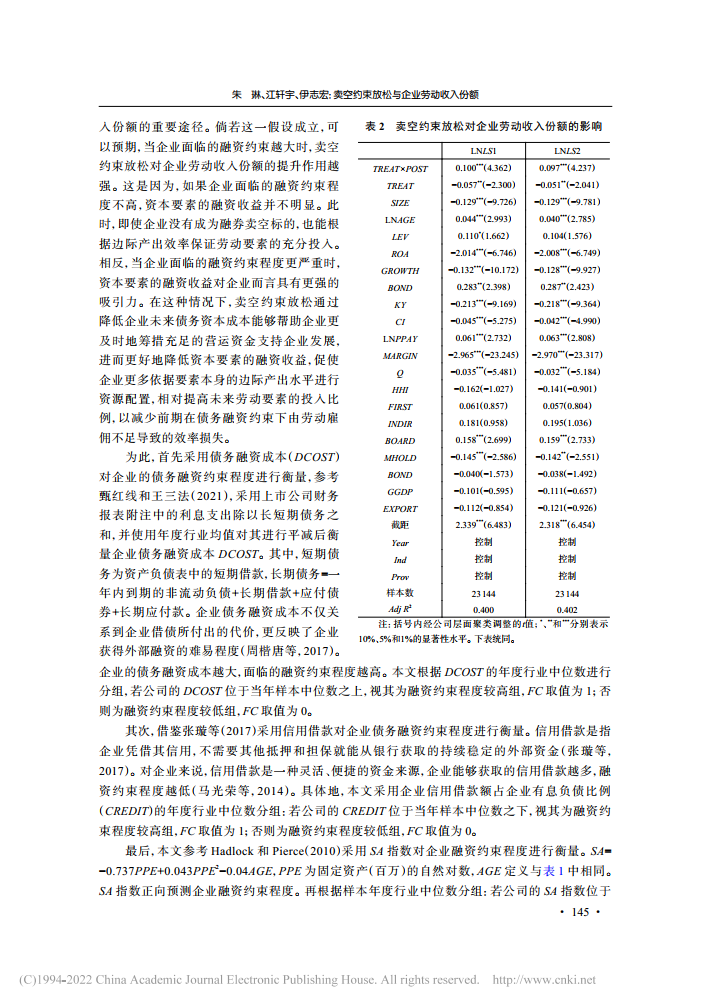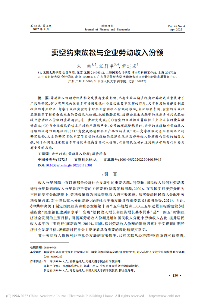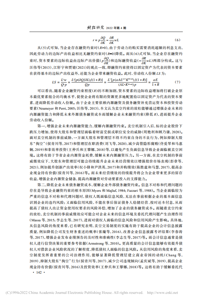 朱琳:卖空约束放松与企业劳动收入份额【2022年第4期,财经研究】