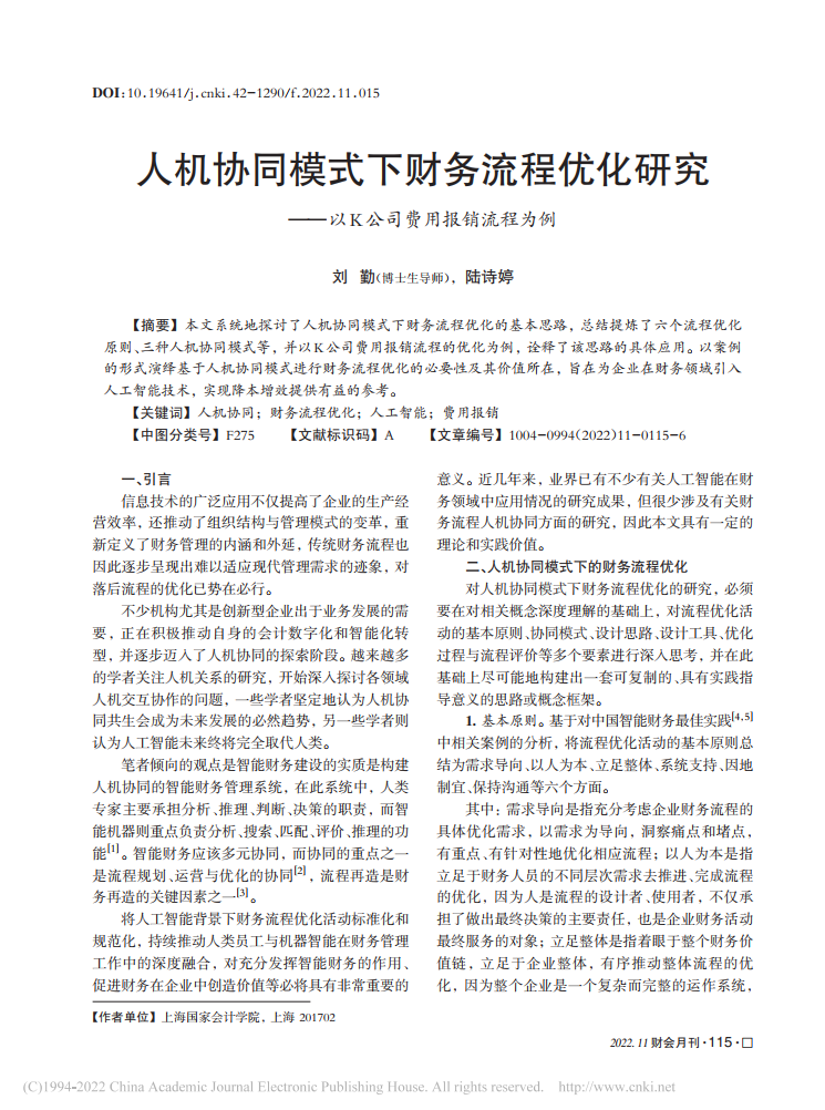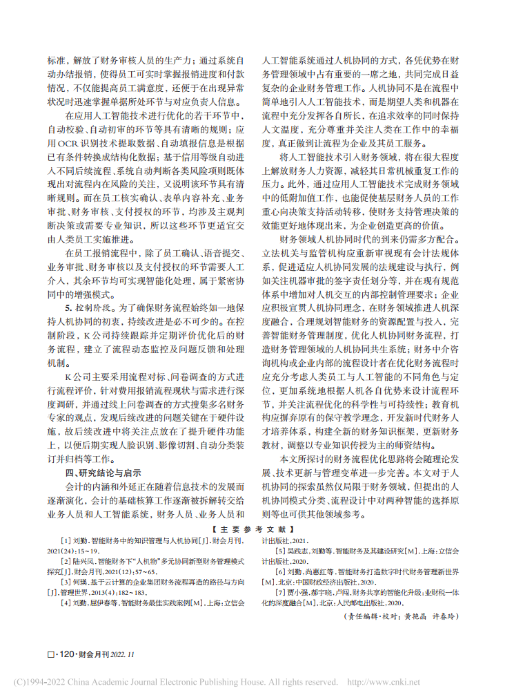 刘勤:人机协同模式下财务流程优化研究——以K公司费用报销流程为例【2022年第11期,财会月刊】
