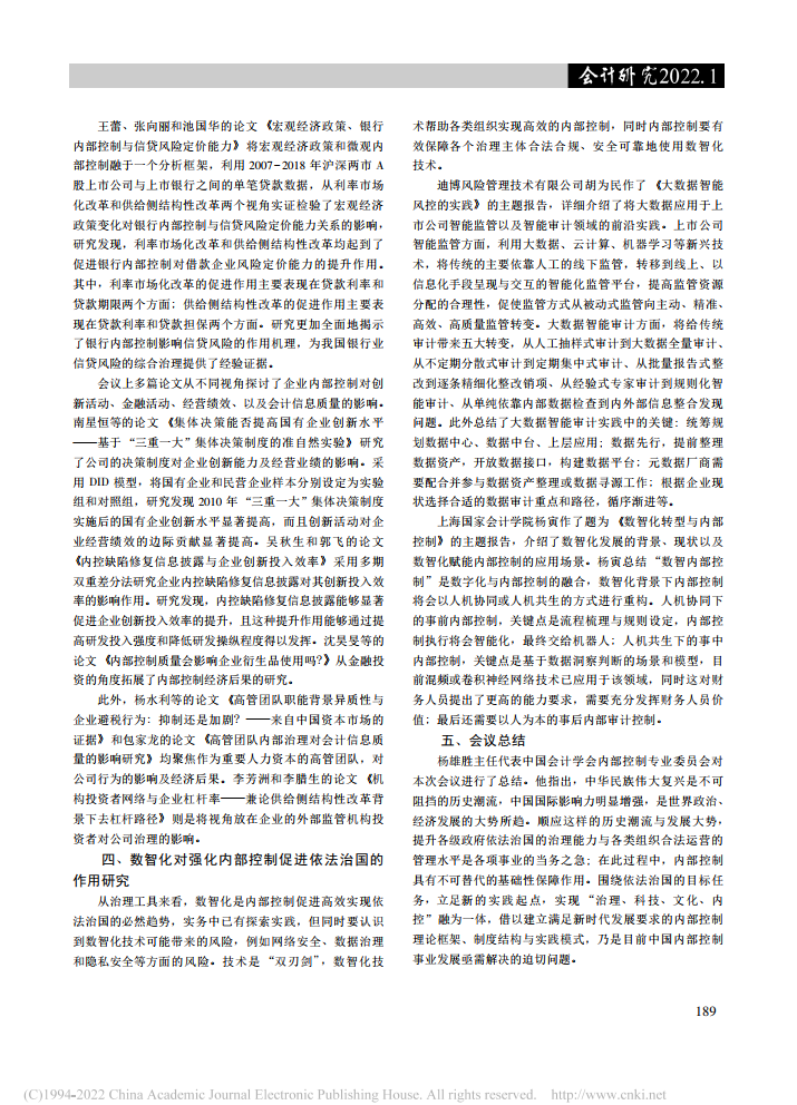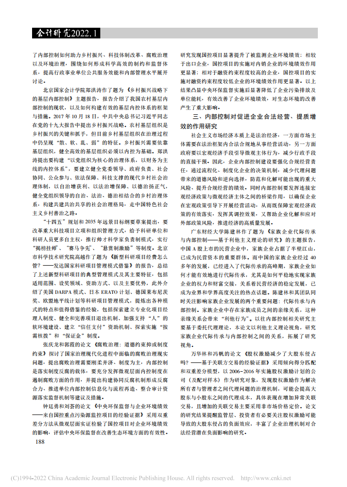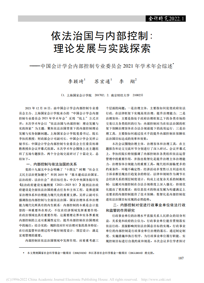 李颖琦、苏宏通:依法治国与内部控制:理论发展与实践探索——中国会计学会内部控制专业委员会2021年学术年会综述【2022年第1期,会计研究】
