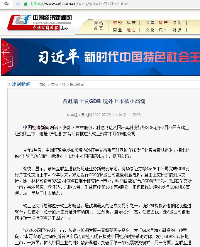 叶小杰:首赴瑞士发GDR 境外上市掀小高潮【2022年7月29日,中国经济时报】