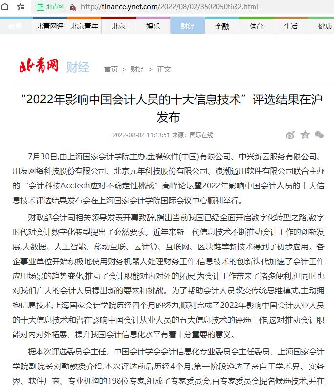 “2022年影响中国会计人员的十大信息技术”评选结果在沪发布【2022年8月2日,北青网】