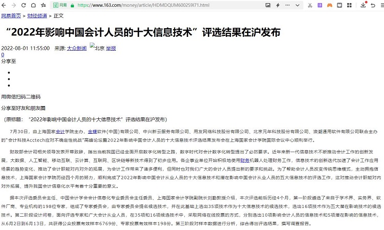 “2022年影响中国会计人员的十大信息技术”评选结果在沪发布【2022年8月1日,网易】