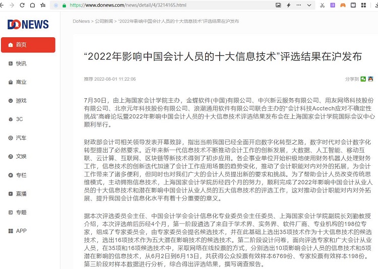 “2022年影响中国会计人员的十大信息技术”评选结果在沪发布【2022年8月1日,DoNews】