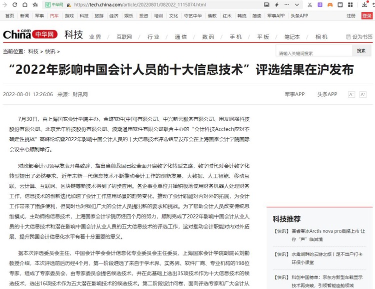 “2022年影响中国会计人员的十大信息技术”评选结果在沪发布【2022年8月1日,中华网】