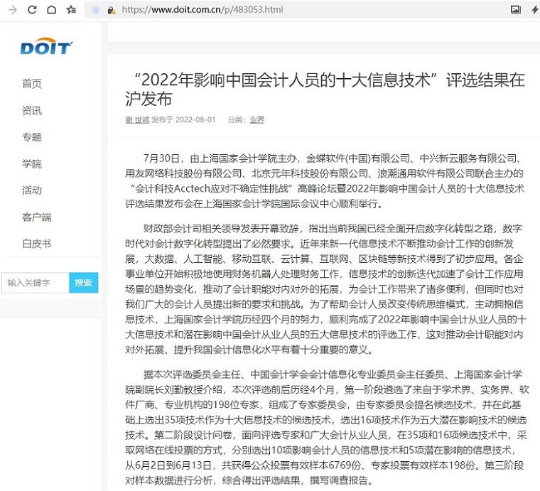 “2022年影响中国会计人员的十大信息技术”评选结果在沪发布【2022年8月1日,DOIT】