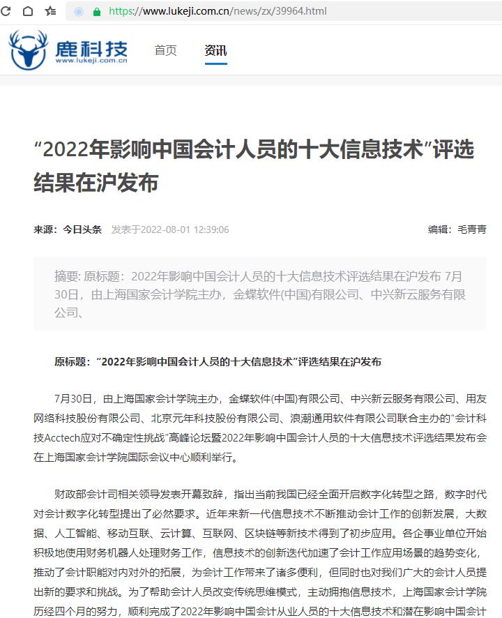 “2022年影响中国会计人员的十大信息技术”评选结果在沪发布【2022年8月1日,鹿科技】