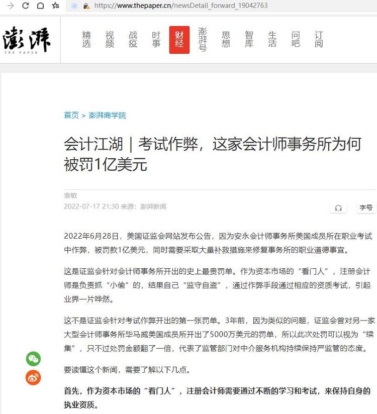 袁敏:会计江湖|考试作弊,这家会计师事务所为何被罚1亿美元【2022年7月17日,澎湃新闻】
