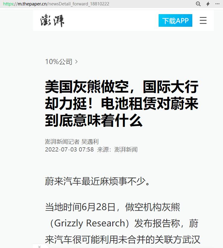 袁敏:美国灰熊做空,国际大行却力挺!电池租赁对蔚来到底意味着什么【2022年7月3日,澎湃新闻】