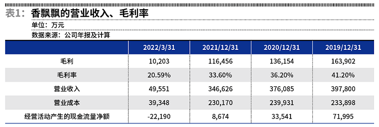 2022年一季度,香飘飘(603711.SH)营业收入为4.96亿元,同比下降28.28%;归属于上市公司股东的净利润亏损5967.66万元,同比下降2105.78%;基本每股收益为-0.14元。从2019年开始,香飘飘的营业收入、毛利和毛利率已经连续三年出现较大幅度的下滑,尤其是2022年一季度,毛利率从2019年度的41.20%下降到了20.59%,直接腰斩。与之相应地,公司的经营活动产生的现金流量净额也显示恶化的趋势。如果不出意外,2022年香飘飘的营业收入、毛利和毛利率将继续以肉眼可见的速度下滑。