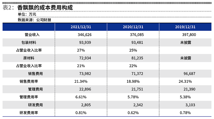 2021年,香飘飘的销售费用为73982万元,占营业收入的比例为21%。销售费用和包装费加起来占了香飘飘营业收入的接近50%,真正可以喝的原材料采购金额占营业收入的比例为23%。由于香飘飘主要采取经销模式,对经销商采取买断式销售,因此再考虑到经销商的利润的话,最终消费者的消费价格中,销售费用、包装费和经销商将至少占比60%,而原材料占终端销售价格的比例或许低于20%。