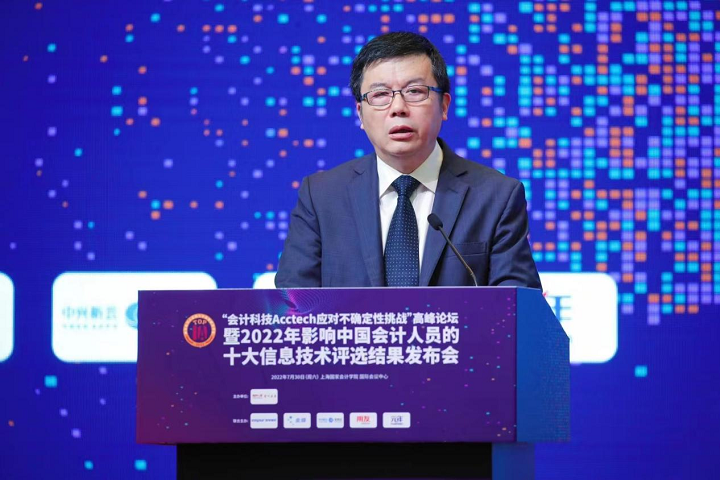 本报记者杨世平 7月30日,由上海国家会计学院主办,金蝶软件(中国)有限公司、中兴新云服务有限公司、用友网络科技股份有限公司、北京元年科技股份有限公司、浪潮通用软件有限公司联合主办的“会计科技Acctech应对不确定性挑战”高峰论坛暨2022年影响中国会计人员的十大信息技术评选结果发布会在上海国家会计学院国际会议中心顺利举行。本次论坛正式发布了2022年影响中国会计人员的十大信息技术的评选结果,并邀请各界嘉宾对入选十大信息技术的应用进行深入解读,对潜在影响的五项信息技术进行前景判断。中国会计学会会计信息化专业委员会、智能财务研究院为本次论坛提供了学术支持。近3万人通过小鹅通、腾讯会议、视频号等线上形式观看论坛直播。