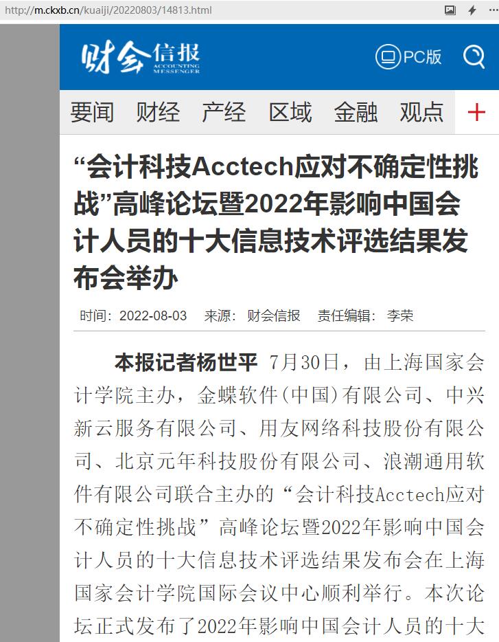 “会计科技Acctech应对不确定性挑战”高峰论坛暨2022年影响中国会计人员的十大信息技术评选结果发布会举办【2022年8月3日,财会信报】