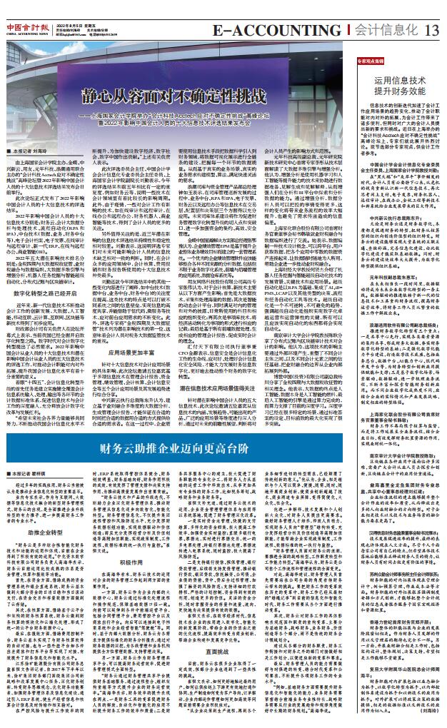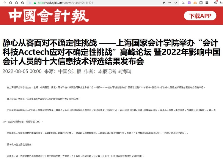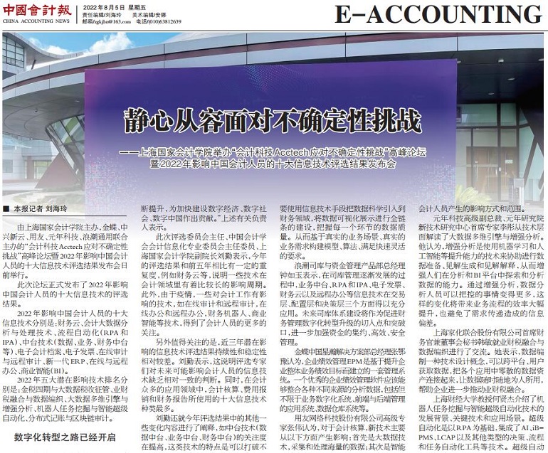 静心从容面对不确定性挑战 ——上海国家会计学院举办“会计科技Acctech应对不确定性挑战”高峰论坛 暨2022年影响中国会计人员的十大信息技术评选结果发布会【2022年8月5日,中国会计报】