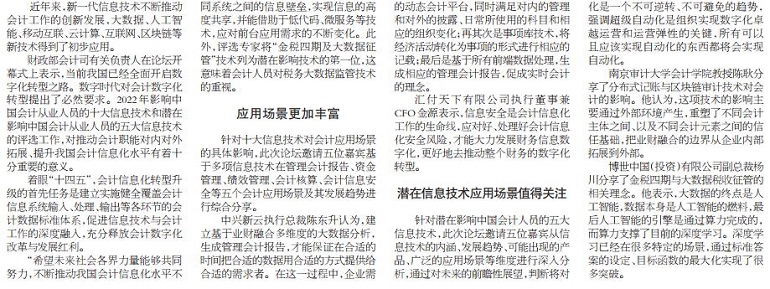 财政部会计司有关负责人在论坛开幕式上表示,当前我国已经全面开启数字化转型之路。数字时代对会计数字化转型提出了必然要求。2022年影响中国会计从业人员的十大信息技术和潜在影响中国会计从业人员的五大信息技术的评选工作,对推动会计职能对内对外拓展、提升我国会计信息化水平有着十分重要的意义。