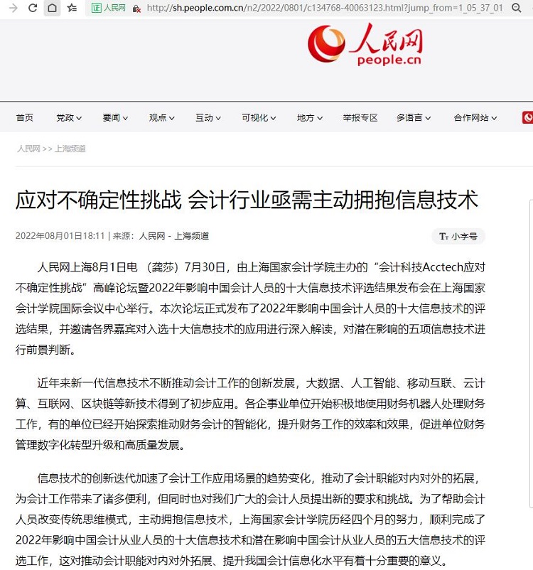 人民网上海8月1日电 (龚莎)7月30日,由上海国家会计学院主办的“会计科技Acctech应对不确定性挑战”高峰论坛暨2022年影响中国会计人员的十大信息技术评选结果发布会在上海国家会计学院国际会议中心举行。本次论坛正式发布了2022年影响中国会计人员的十大信息技术的评选结果,并邀请各界嘉宾对入选十大信息技术的应用进行深入解读,对潜在影响的五项信息技术进行前景判断。