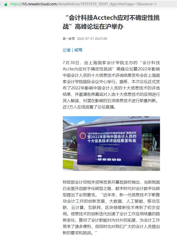 7月30日,由上海国家会计学院主办的“会计科技Acctech应对不确定性挑战”高峰论坛暨2022年影响中国会计人员的十大信息技术评选结果发布会在上海国家会计学院国际会议中心举行。据悉,本次论坛正式发布了2022年影响中国会计人员的十大信息技术的评选结果,并邀请各界嘉宾对入选十大信息技术的应用进行深入解读,对潜在影响的五项信息技术进行前景判断。近3万人在线观看了论坛直播。