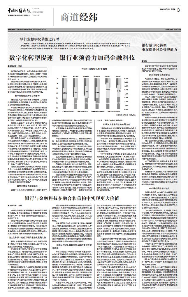 马长峰:银行数字化转型 重在提升风险管理能力【2022年8月9日,中国经济时报】