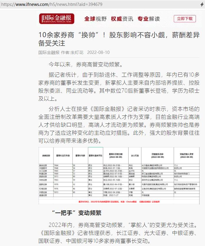 周赟:10余家券商“换帅”!股东影响不容小觑,薪酬差异备受关注【2022年8月10日,国际金融报】