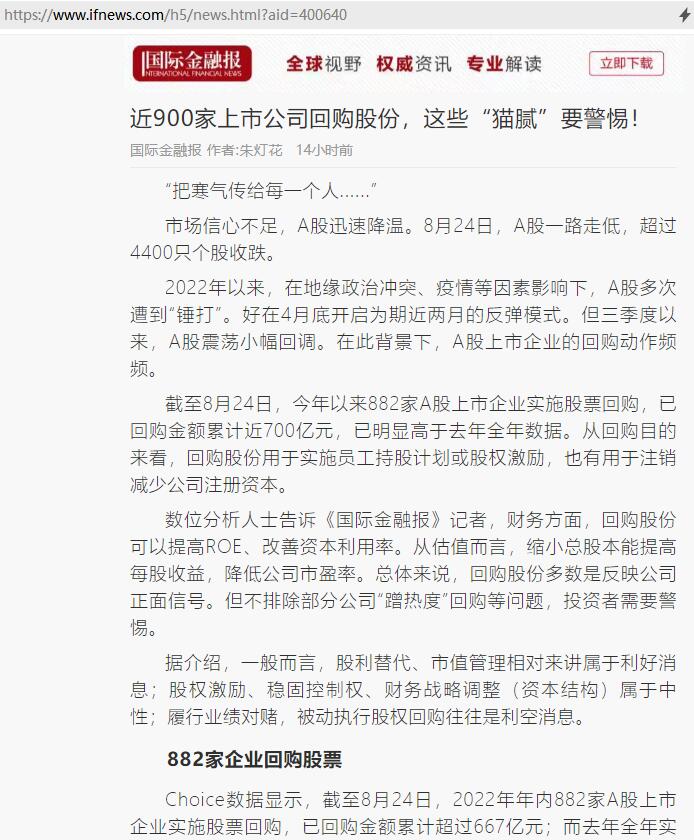 刘凤委:近900家上市公司回购股份,这些“猫腻”要警惕!【2022年8月24日,国际金融报】