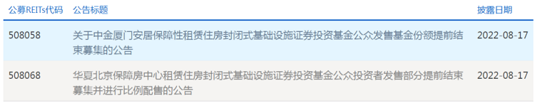 8月16日,红土深圳安居REIT、华夏北京保障房REIT和中金厦门安居REIT陆续发布公告称,公众投资者累计有效认购申请份额已超过本次公众投资者的初始募集规模上限,决定提前1天结束公众投资者的募集,8月17日不再接受公众投资者的认购申请。