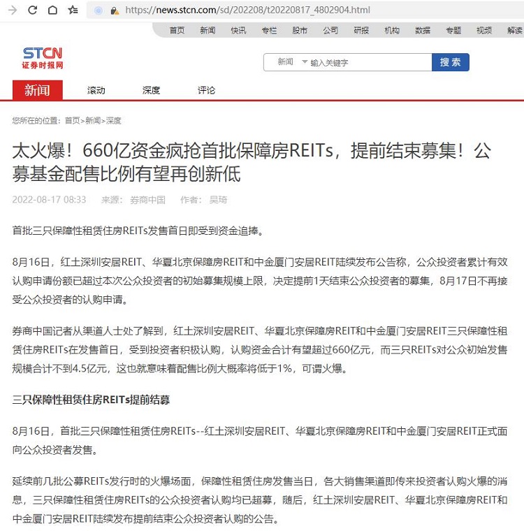 周贇:太火爆!660亿资金疯抢首批保障房REITs,提前结束募集!公募基金配售比例有望再创新低【2022年8月17日,证券时报】